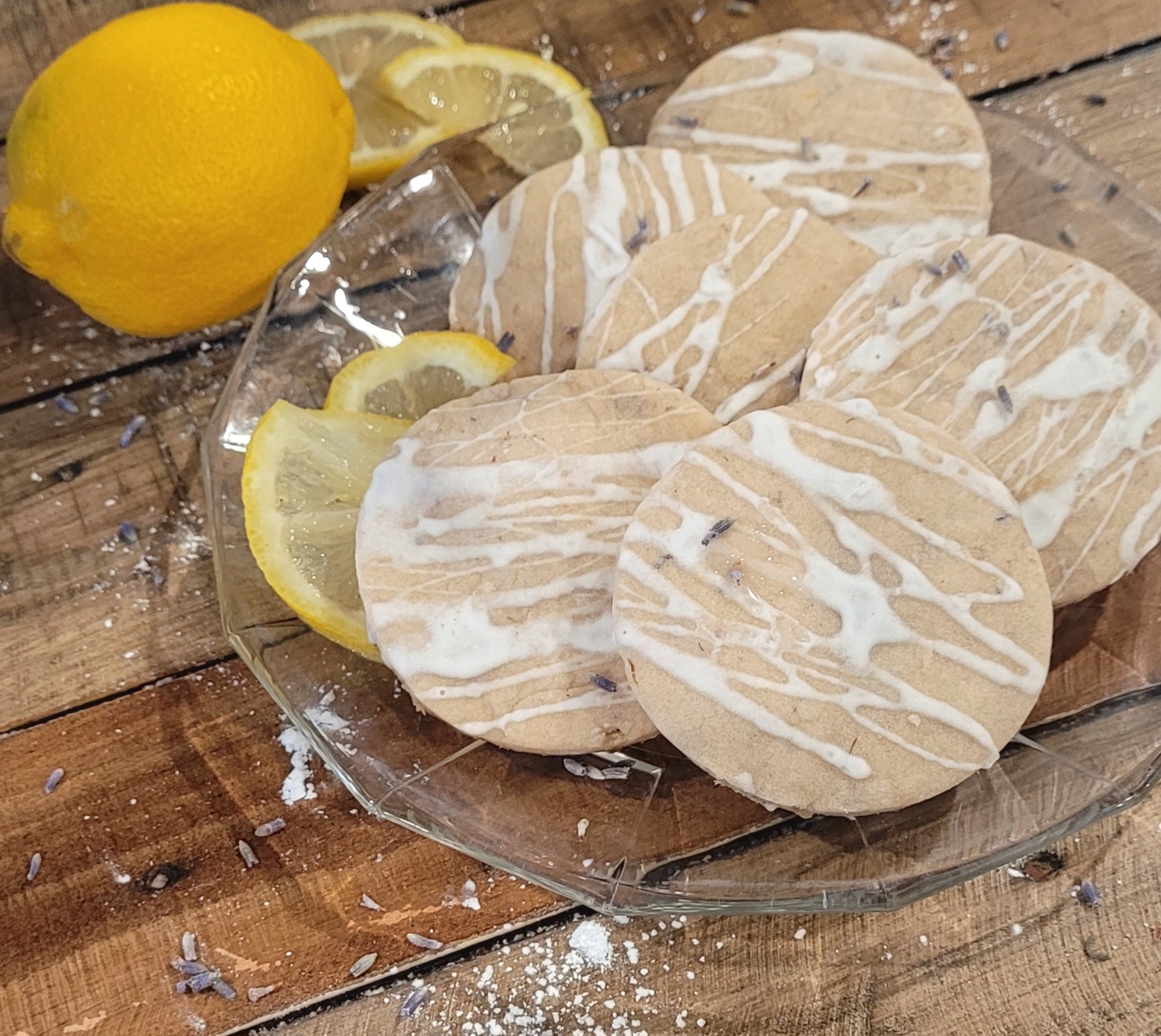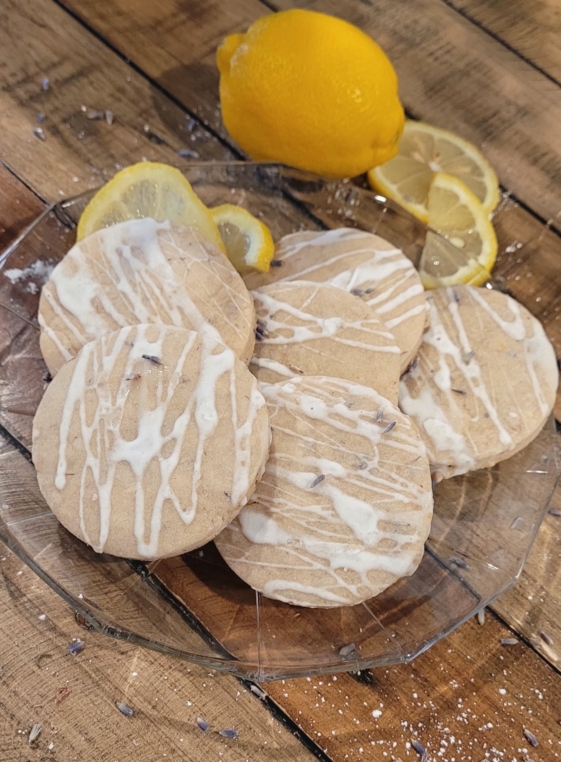 6 buttery shortbread cookies infused with a subtle citrus zest and delicate lavender notes, elegantly drizzled with smooth vanilla icing—a harmonious blend of flavors that’s both refreshing and indulgent.